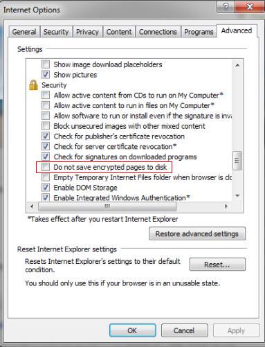 Vào menu Tools / Internet Options, tại hộp thoại Intenet Options chọn tab Advanced, trong mục Security bỏ lựa chọn "Do not save encrypted page to disk". Sau đó phải khởi động lại IE.