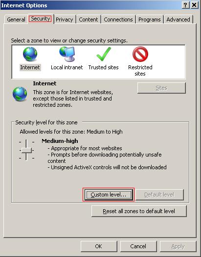 - Chọn "Internet" khu vực, sau đó nhấn vào nút “Custom level ... ".